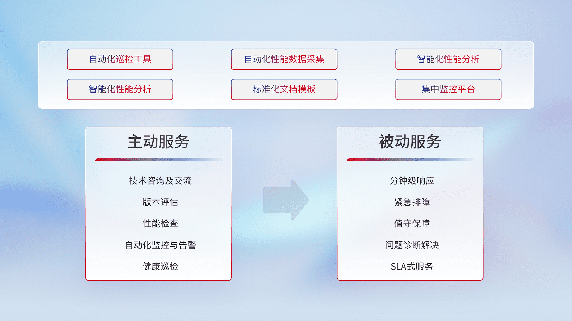 智能化工具和标准化文档,,,保障服务质量,,,提供主动服务(包含技术咨询、、版本评估、、、、性能检查、、自动化监控与告警、、健康巡检)和被动服务包含(分钟级响应、、紧急排障、、、值守保障、、问题诊断解决、、SLA服务)。。。