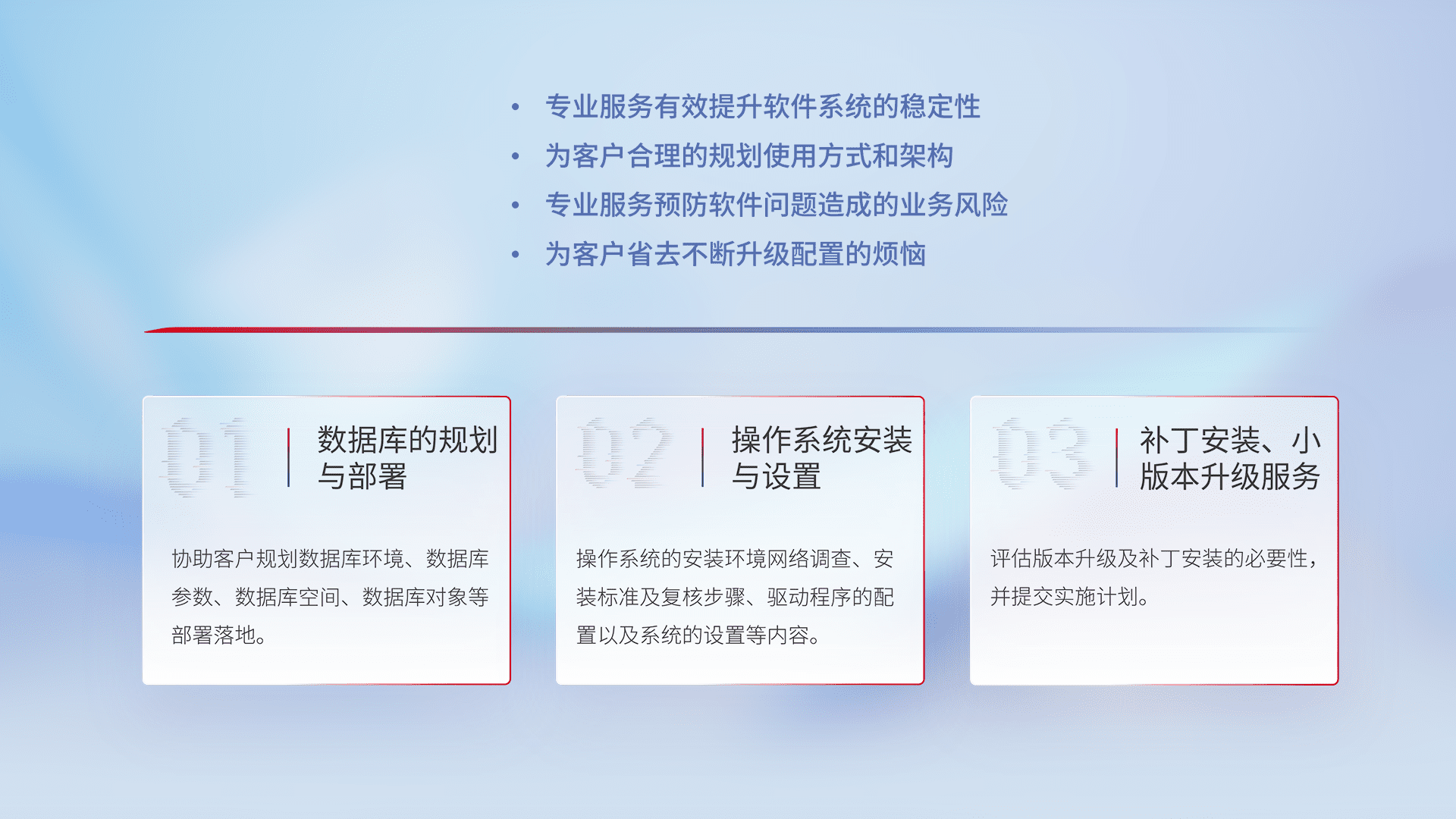 为客户提供软件规模升级、、、、快速部署、、、按需配置的专业服务,,,从数据库的规划与部署到操作系统的安装与设置,,,再到补丁安装和小版本升级提供支持。。。